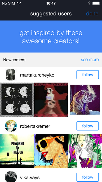 このアプリの背後にあるアイデアは、図面やGIFを作成 strong>したり、既存の画像を編集したりすることで、芸術的な側面を活用できる空白の「キャンバス」を提供することです。画像をソーシャルに共有します(もちろん)。他のソーシャルネットワークと同様に( Facebook taglink>、 Twitter taglink>、Instagramなど)、他の人が作成した画像にいいねやコメントを付けたり、自分が尊敬するコンテンツを持っている友達や見知らぬ人をフォローしたりすることもできます。